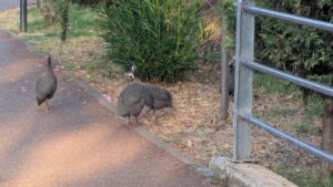 Aside from the numbers, it’s a beautiful walk, with lots of off-road trails along the way, and in many places there are THREE walkways to follow. One is dirt and gravel, and another is a nice asphalt running path which veers into the woods. I’ll try that next time. There are three basic “gyms” on the way, with outdoor equipment, a place to play ping-pong, plus at least six coffee shops—no big surprise there! The walk is nicely covered about 90 percent, which is great when it’s hot, but we’ve actually gotten a heat reprieve the past few days and it’s been very nice outside. For a city of this size to have such a place of solitude and nature really makes it a pleasurable stay! I encountered what MAY be Helmeted Guinea Fowl (thank you Google lens!), which I would have identified at pheasants at first glance. Regardless of what they were, they were a nice surprise, along with several species of ducks. What is unique is that the lake has NO boats, and no fishing allowed, so it is all for show, which works for me.